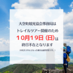 - 不在のお知らせ10月19日(日)はトレイルツアー開催のため、観光協会事務局は終日不在とさせていただきます。ご不便をおかけいたしますが、何卒ご理解のほどよろしくお願い申し上げます。なお、ツアーが中止となった場合は通常通り営業いたします。 […]