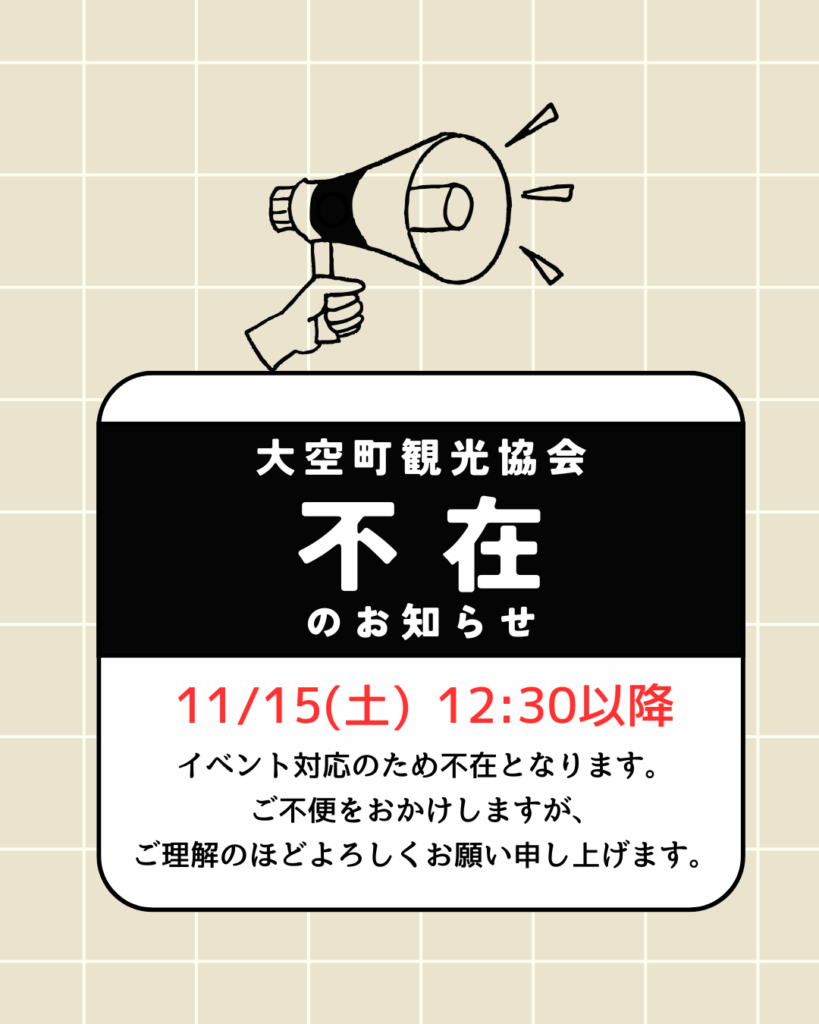 イベント対応のため11月15日(土)の12時30分以降、大空町観光協会事務局は不在とさせていただきます。ご不便をおかけしますが、ご理解のほどよろしくお願い申し上げます。