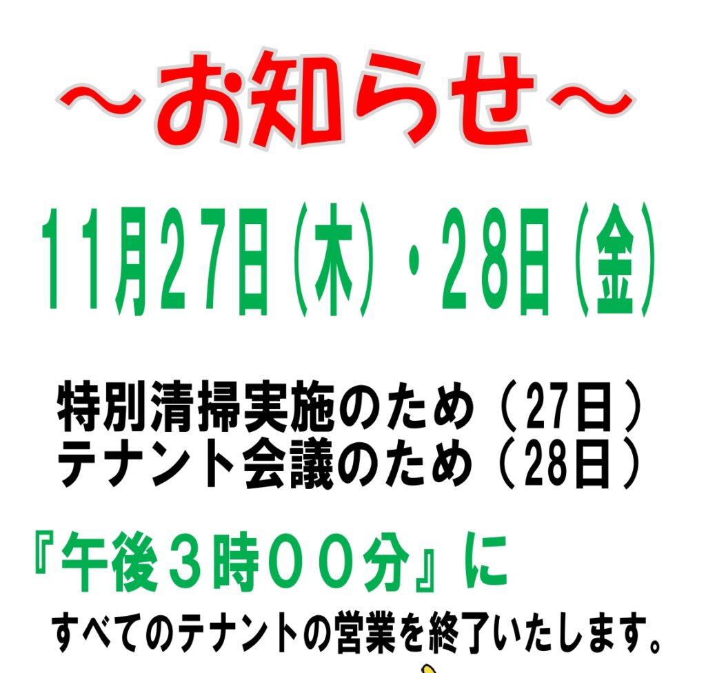 11月27日(木)と28日(金)はメルヘンぴっと内の特別清掃とテナント会議が実施されるため、両日とも午後3時に全てのテナントの営業を終了いたします。ご迷惑をおかけいたしますが、ご理解とご協力をお願い申し上げます。