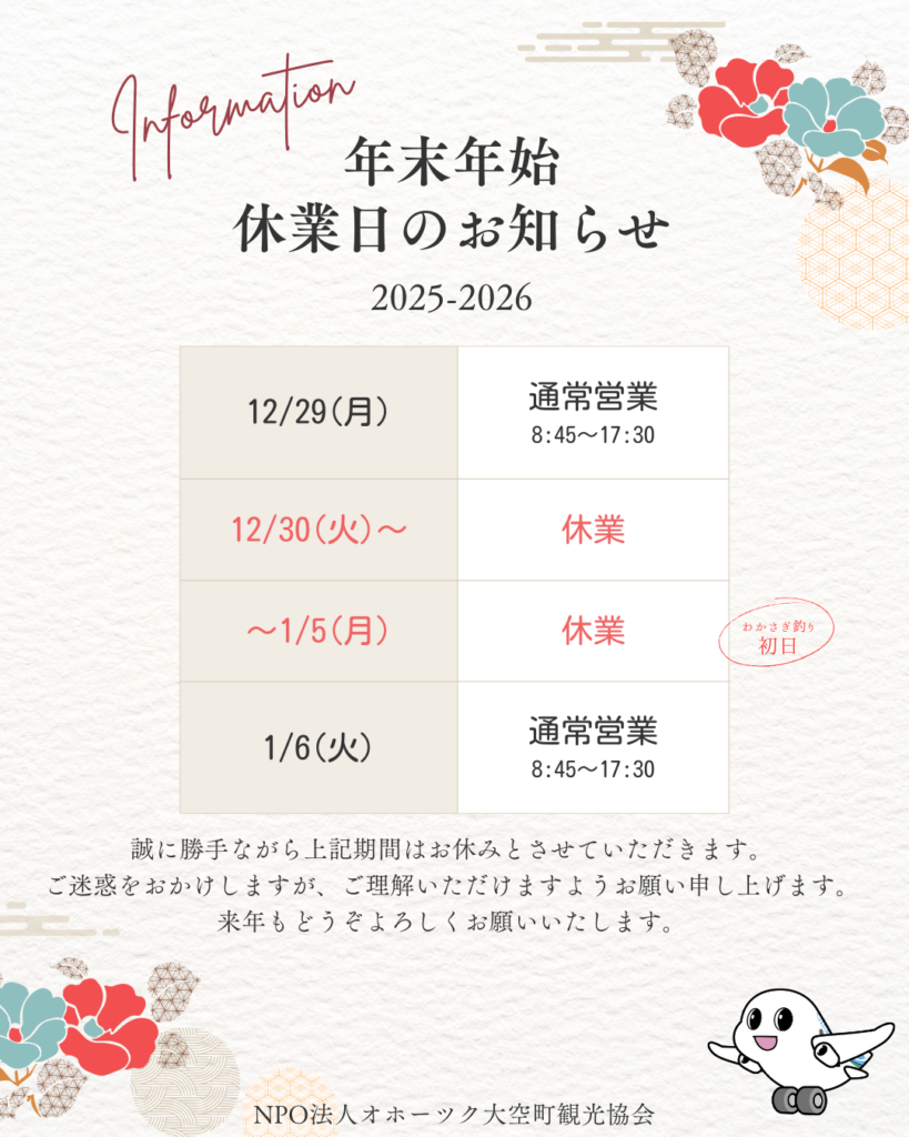 誠に勝手ながら、2025年12月30日(火)から2026年1月5日(月)までの期間は休業とさせていただきます。