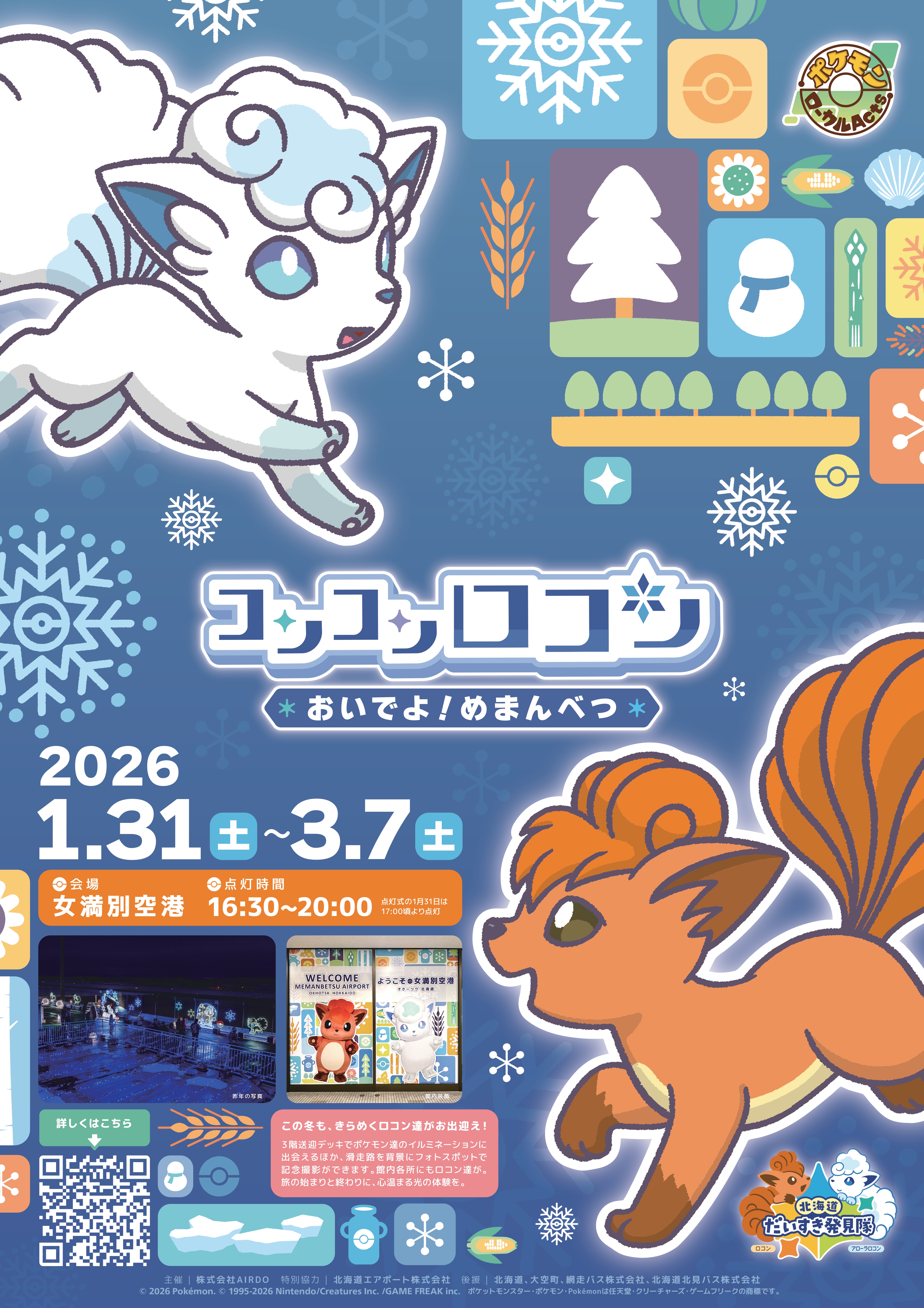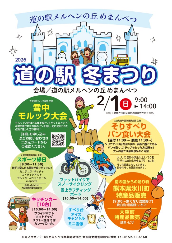 イベント情報 2026 1/22 お知らせ 2026-01-22 2026-01-22 ◆コンコンロコン~おいでよ!めまんべつ~ 1月31日(土)から3月7日(土)まで◆道の駅冬まつり 2月1日(日)この冬もイベント目白押し!ぜひお越しください! お知らせ SNSでシェアしてね URLをコピーしました! バードウォッチングツアーの参加者募集中! 関連記事 バードウォッチングツアーの参加者募集中! 2025-12-23 2026年氷上わかさぎ釣りに関するお知らせ 2025-12-01 大空町へ訪れる皆さまへお願い 2025-11-21
