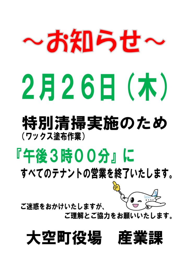 お知らせ 2026 2/20 お知らせ 2026-02-20 2026-02-20 2月26日(木)はメルヘンぴっと内の特別作業が実施されるため、午後3時に全テナントの営業を終了いたします。ご迷惑をおかけいたしますが、ご理解とご協力をお願い申し上げます。 お知らせ SNSでシェアしてね URLをコピーしました! 大空町へ訪れる皆さまへお願い 関連記事 大空町へ訪れる皆さまへお願い 2025-11-21