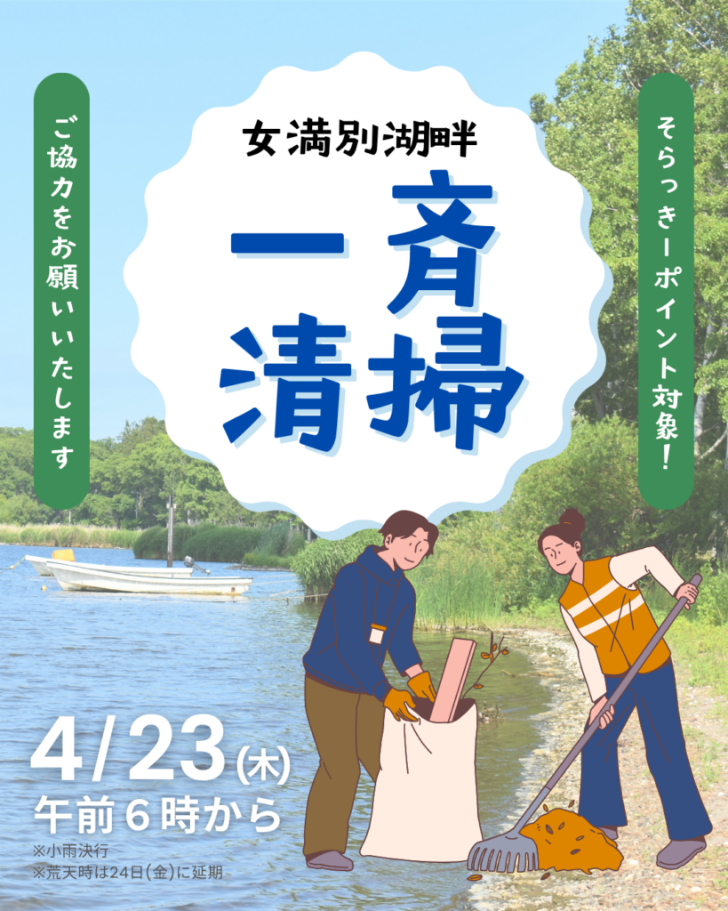 4月23日(木)の朝6時から女満別湖畔一斉清掃を行います。早朝からの作業ですが、ご協力をお願い申し上げます。暖かい服装で、各自でゴム手袋、長靴、レーキ、箒などあればご持参ください。※小雨決行です。荒天の場合、翌日24日に延期になります。※...