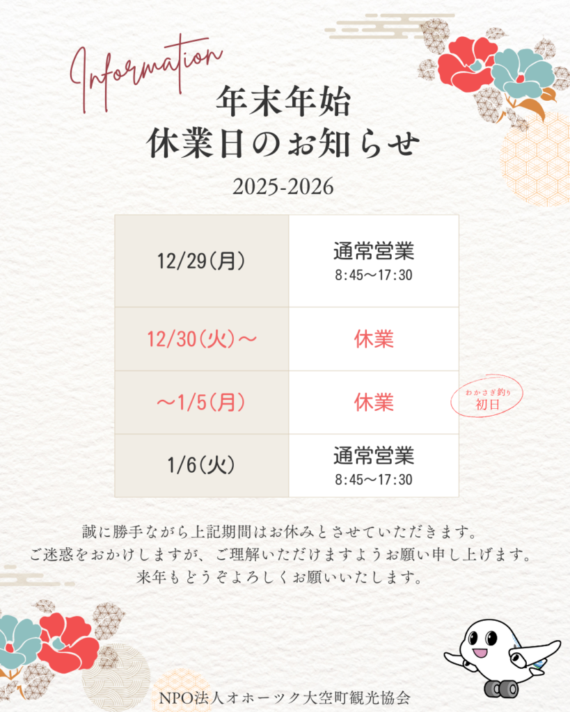 誠に勝手ながら、2025年12月30日(火)から2026年1月5日(月)までの期間は休業とさせていただきます。ご迷惑をおかけいたしますが、期間中は事務所不在となりますので、何卒ご了承くださいますようお願い申し上げます。なお、新年は2026年1月6日(火)よ... -